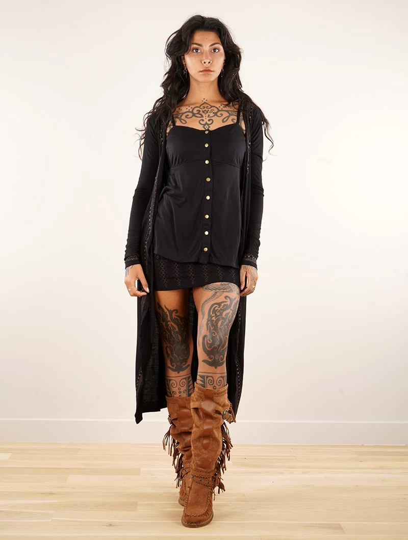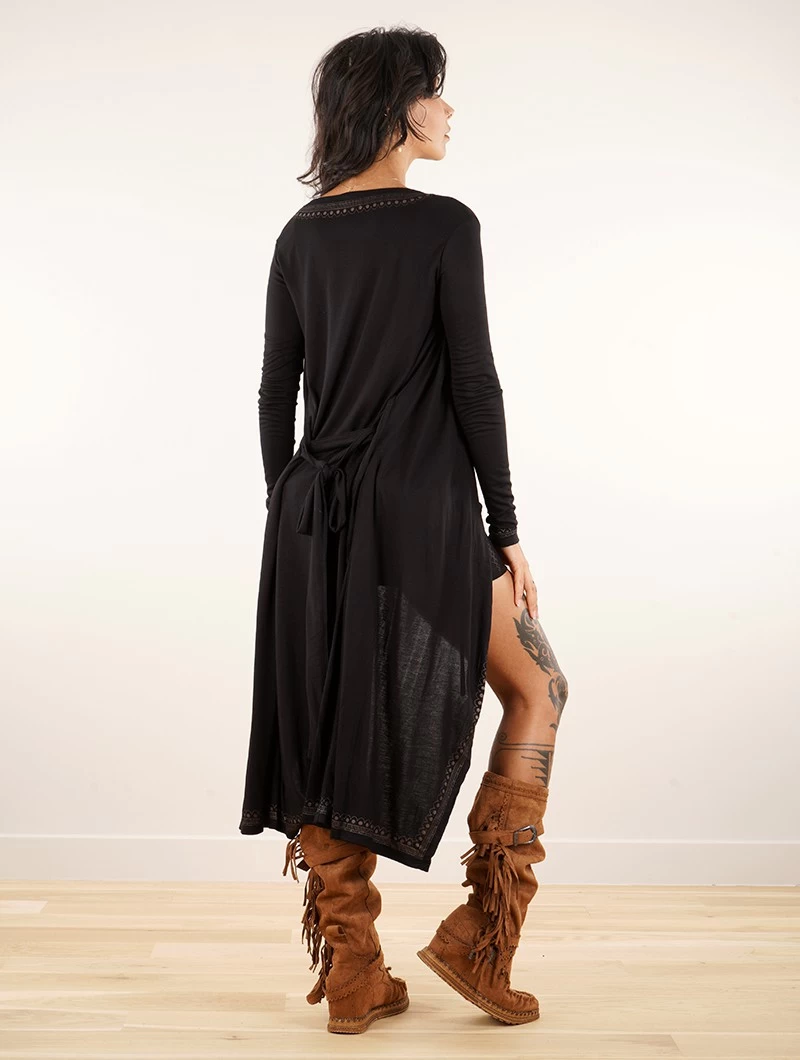 - Super imprimé éthnique “Indie” en liseré en bas des manches et sur les bords du cache coeur – du col aux extrémités
