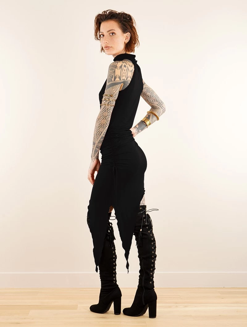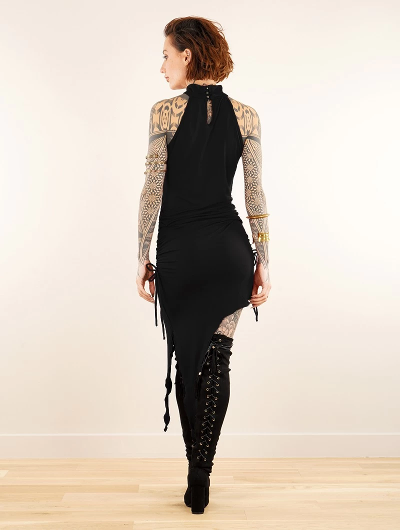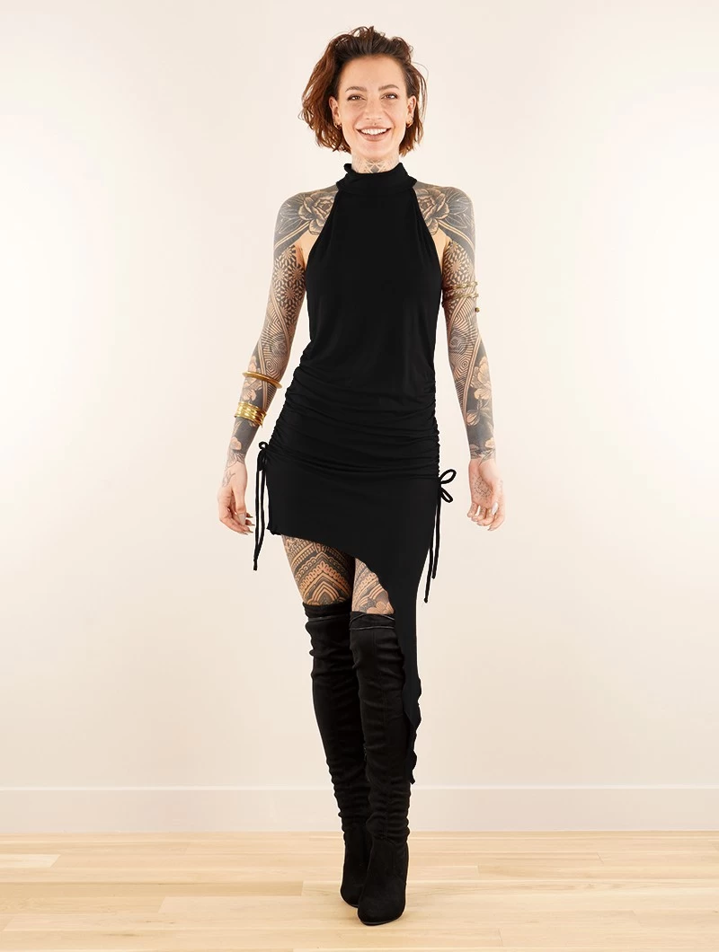 - Galons ajustables sur les côtés qui permettent de jouer sur l’asymétrie et sur l’effet plissé