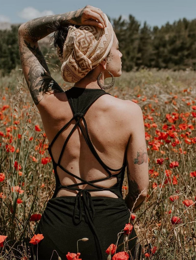 - Joli robe dos nu sans manches avec col en V et laçage à nouer dans le dos