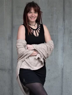 - Les découpes forment un décolleté plongeant qui peut nécessiter le port d’une brassière