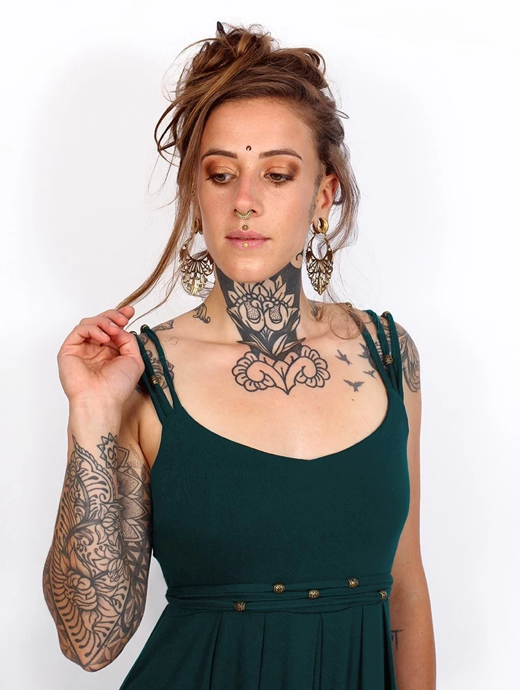 - Bretelles et ceinture intégrée à triple lanières décorées de nombreuses perles en laiton