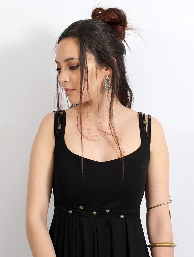 - Bretelles et ceinture intégrée à triple lanières décorées de nombreuses perles en laiton