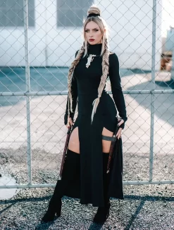 - Belle robe sans manches à dos ouvert et décolleté en V décoré de nombreuses lanières verticales