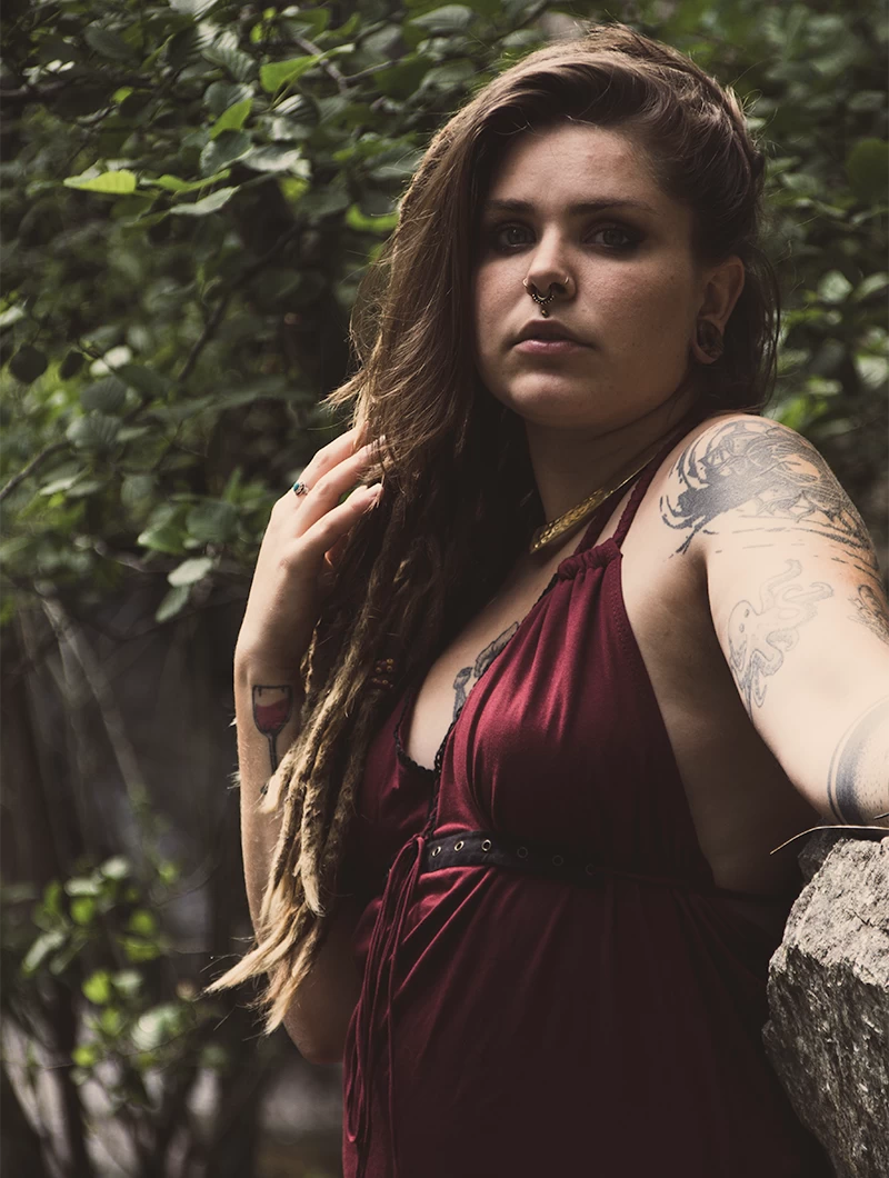 - Robe légère avec le dos dénudé recouvert d’un simple drapé décoré d’un anneau et remontant dans le cou