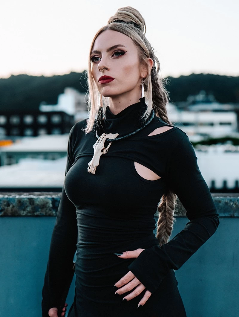 - Col montant avec ouvertures sur les épaules et au dessus de la poitrine