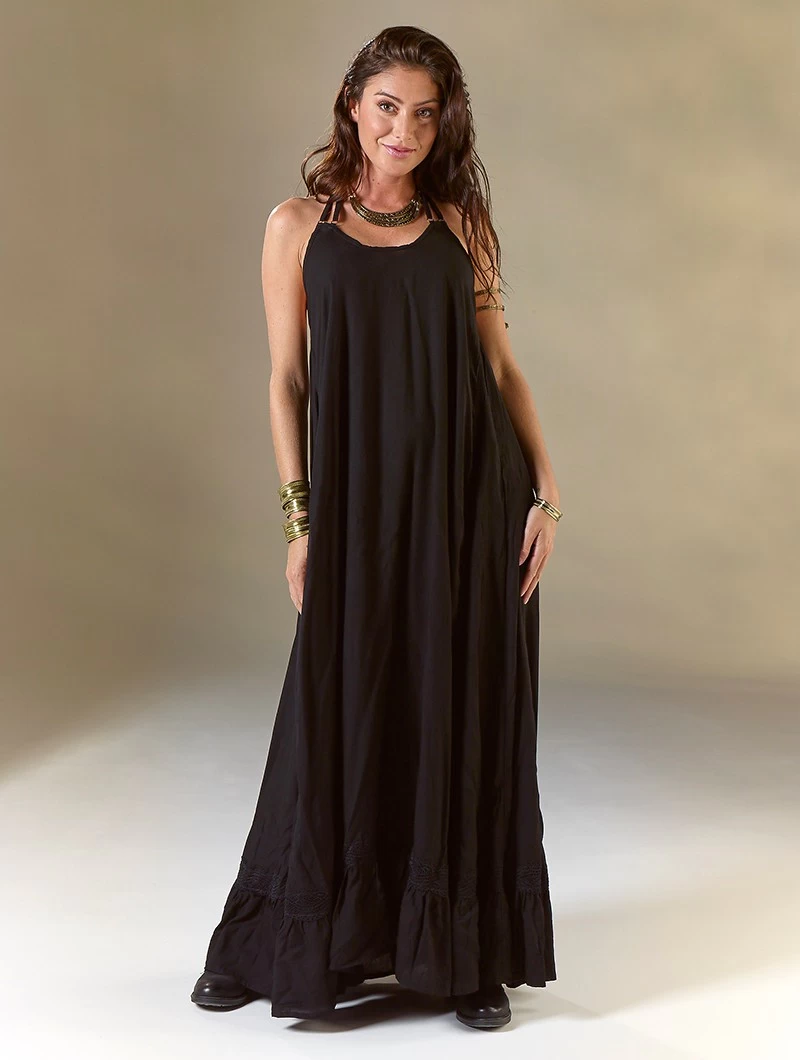 - Robe légère à doubles bretelles nouées dans le dos avec un pièce en faux cuir
