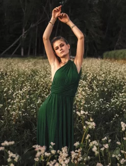 - Décolleté plongeant légèrement en V et dos dénudé avec deux bretelles retenant le bas du dos nu