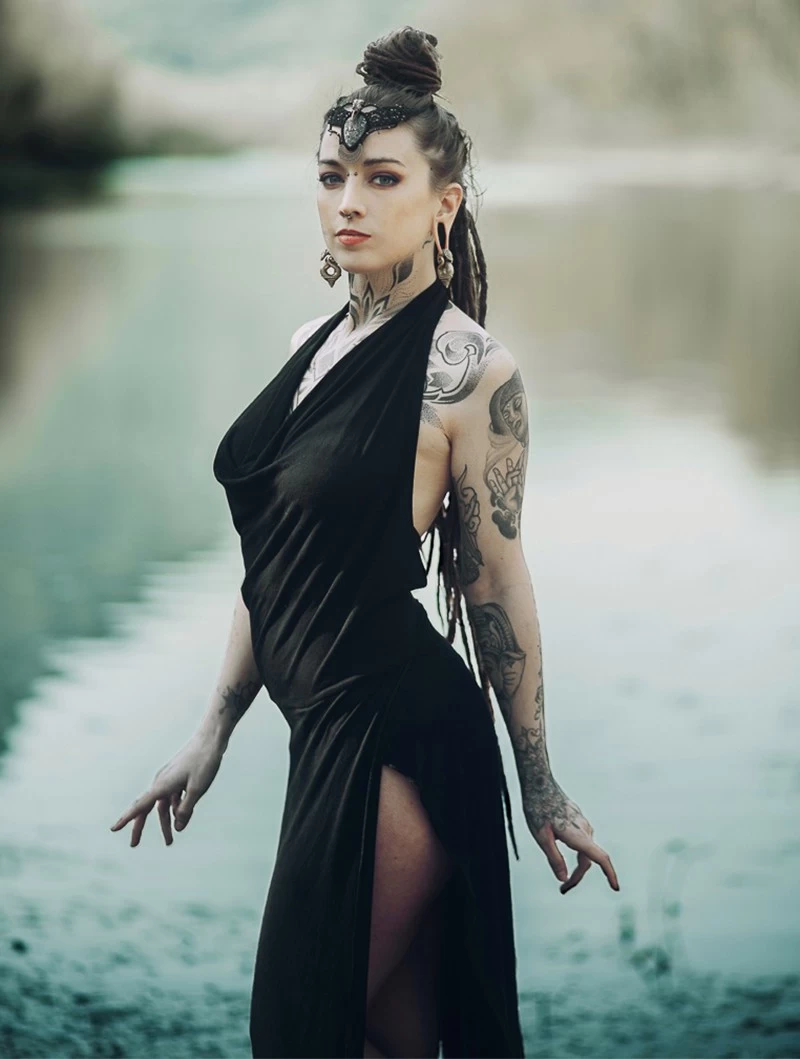 - Fendue sur les deux côtés avec des pans superposés qui cachent le haut des cuisses
