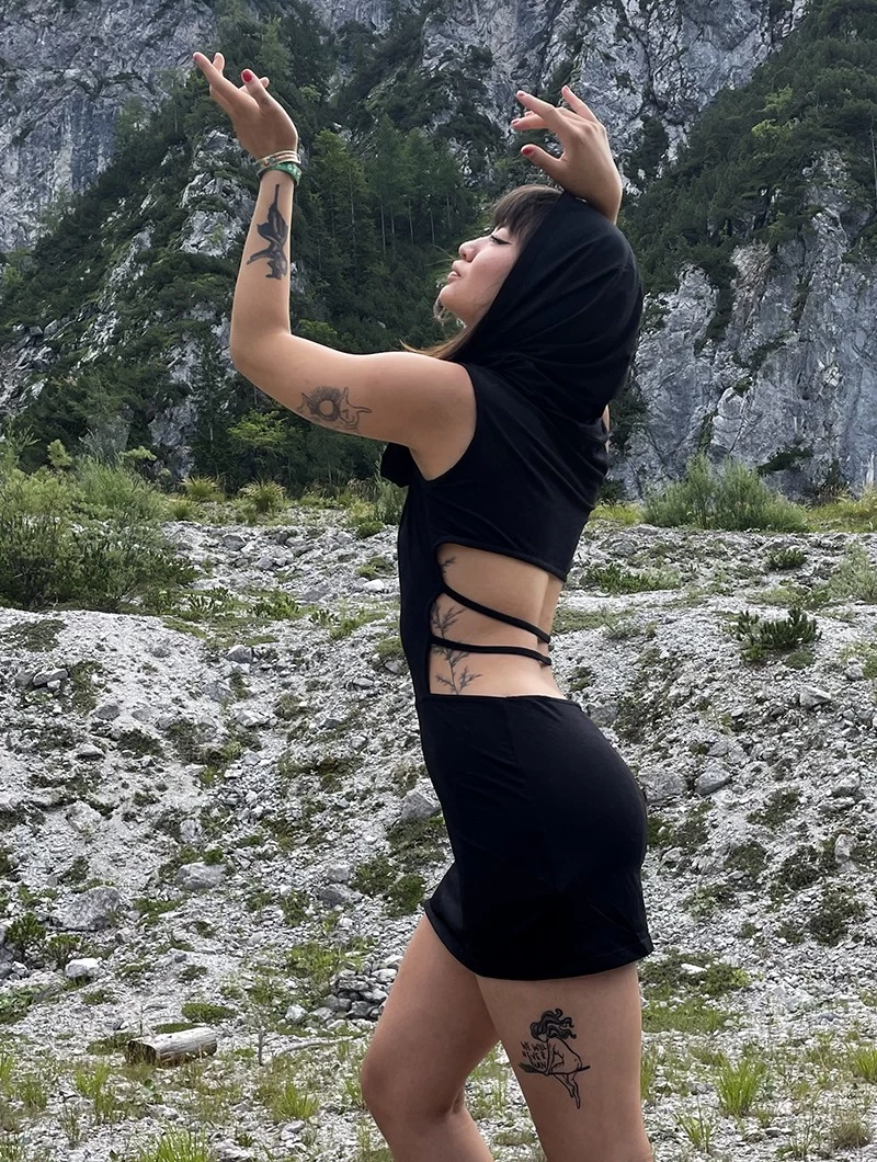 - Joli dos nu décoré de lanières et fini en ouvertures en pointes sur les côtés